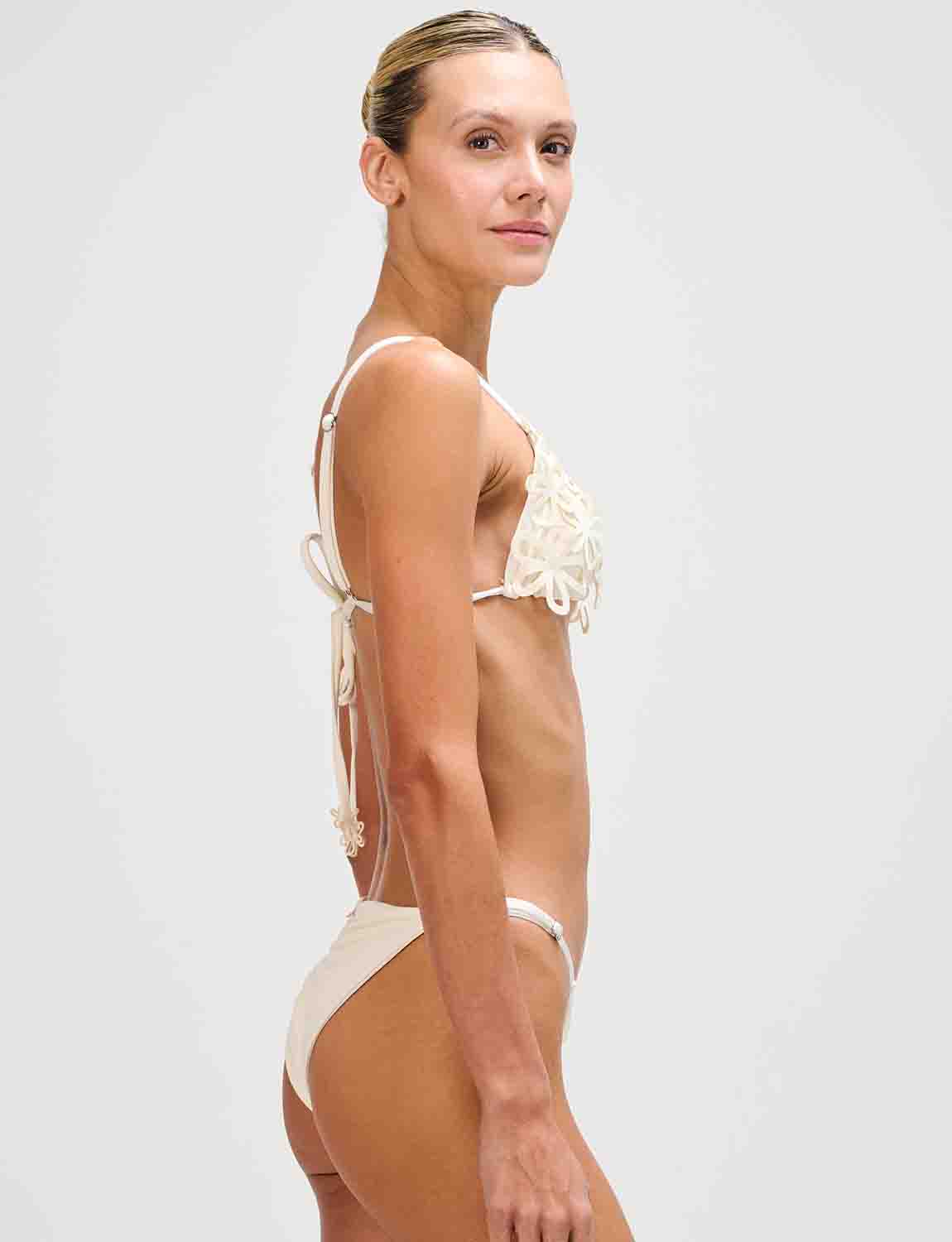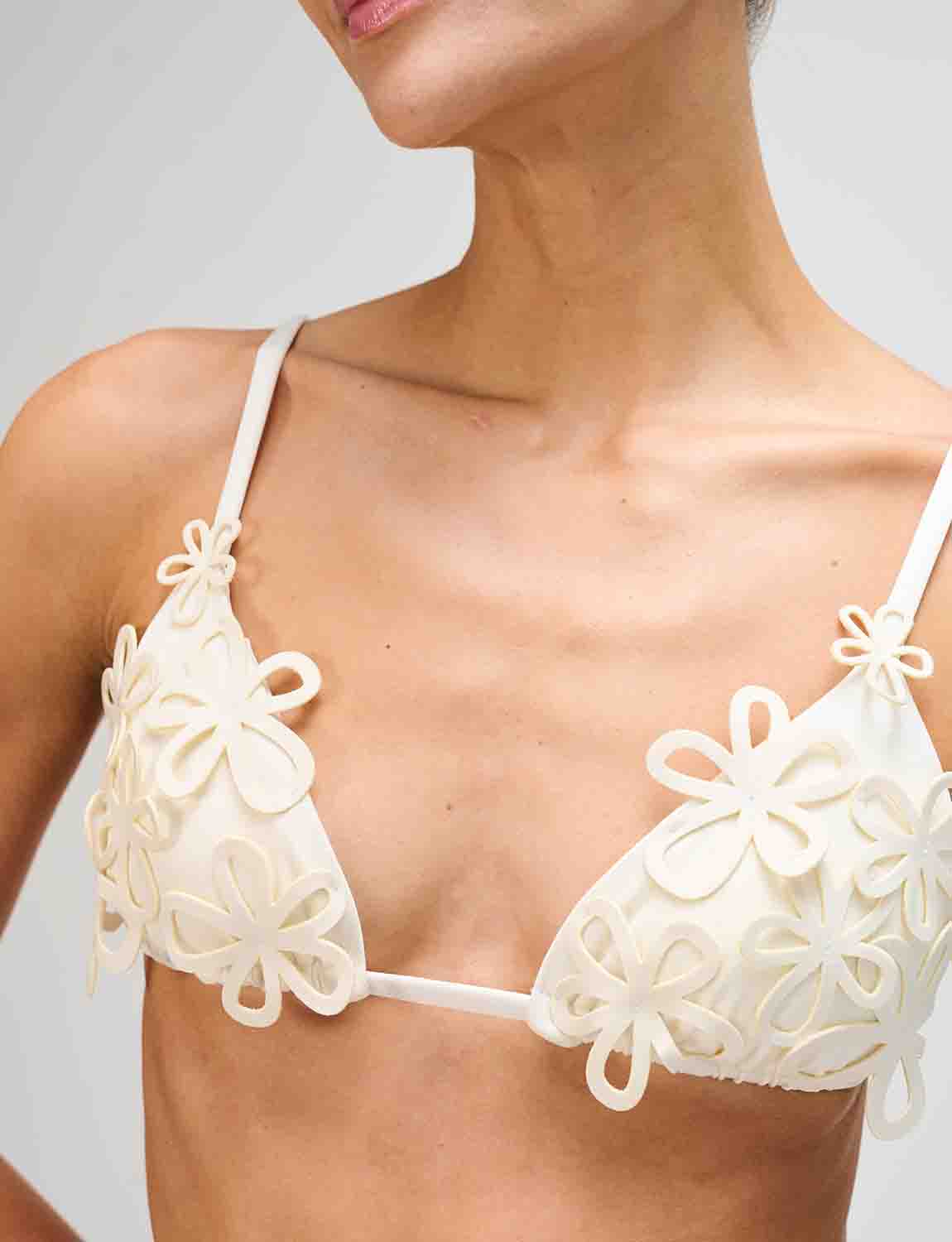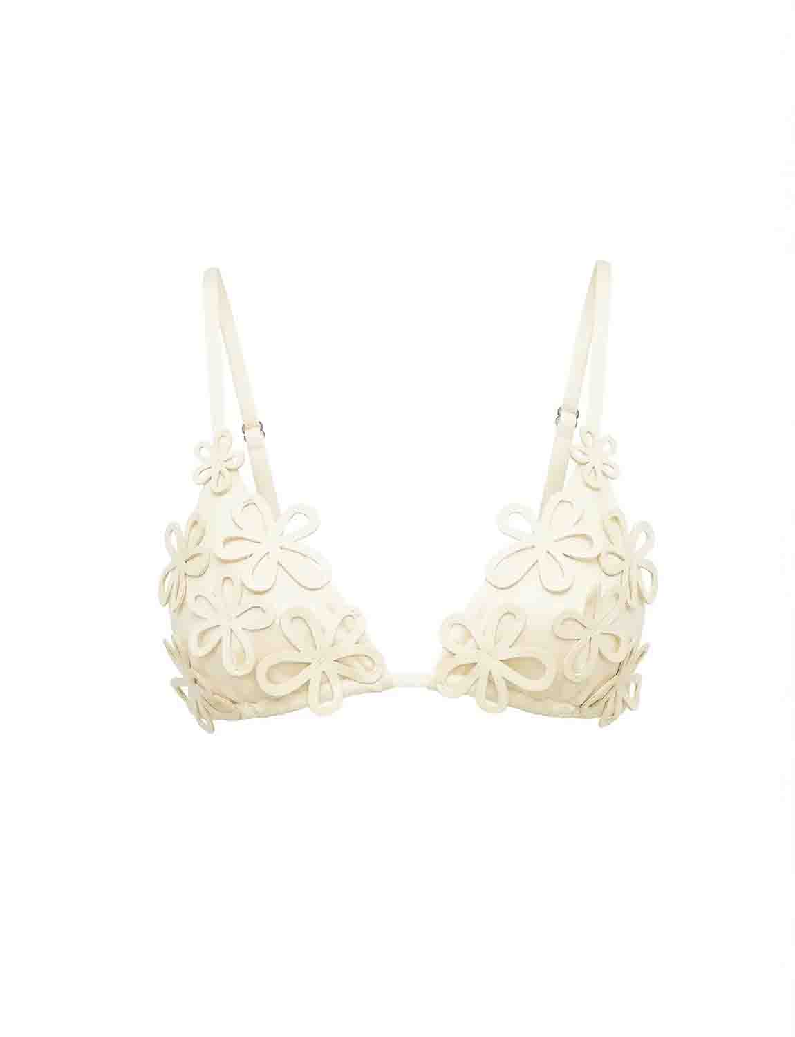 Top triangular con apliques decorativos laminados en corte láser, cosidos a mano. Cuenta con tiras y espalda ajustables.