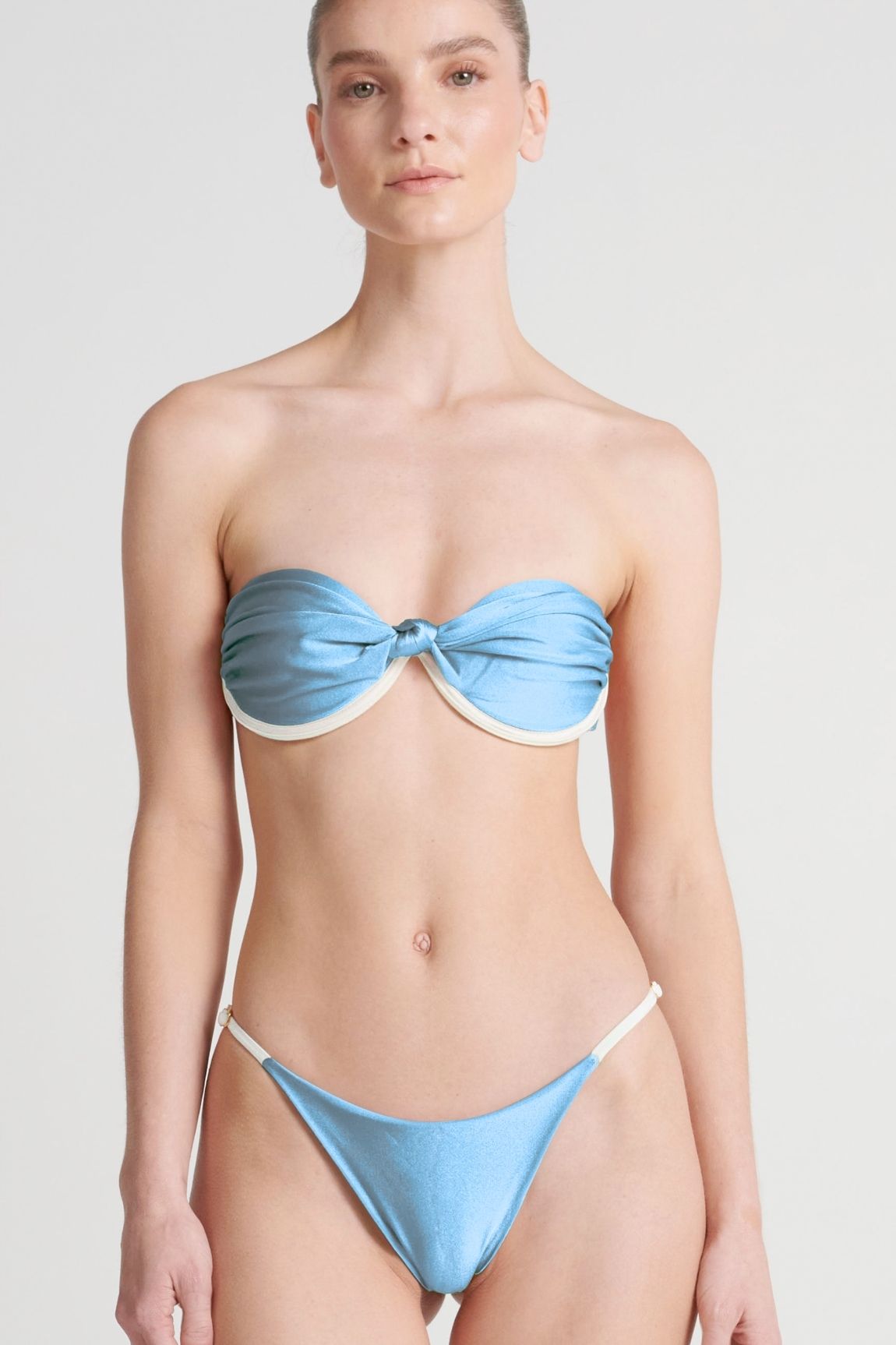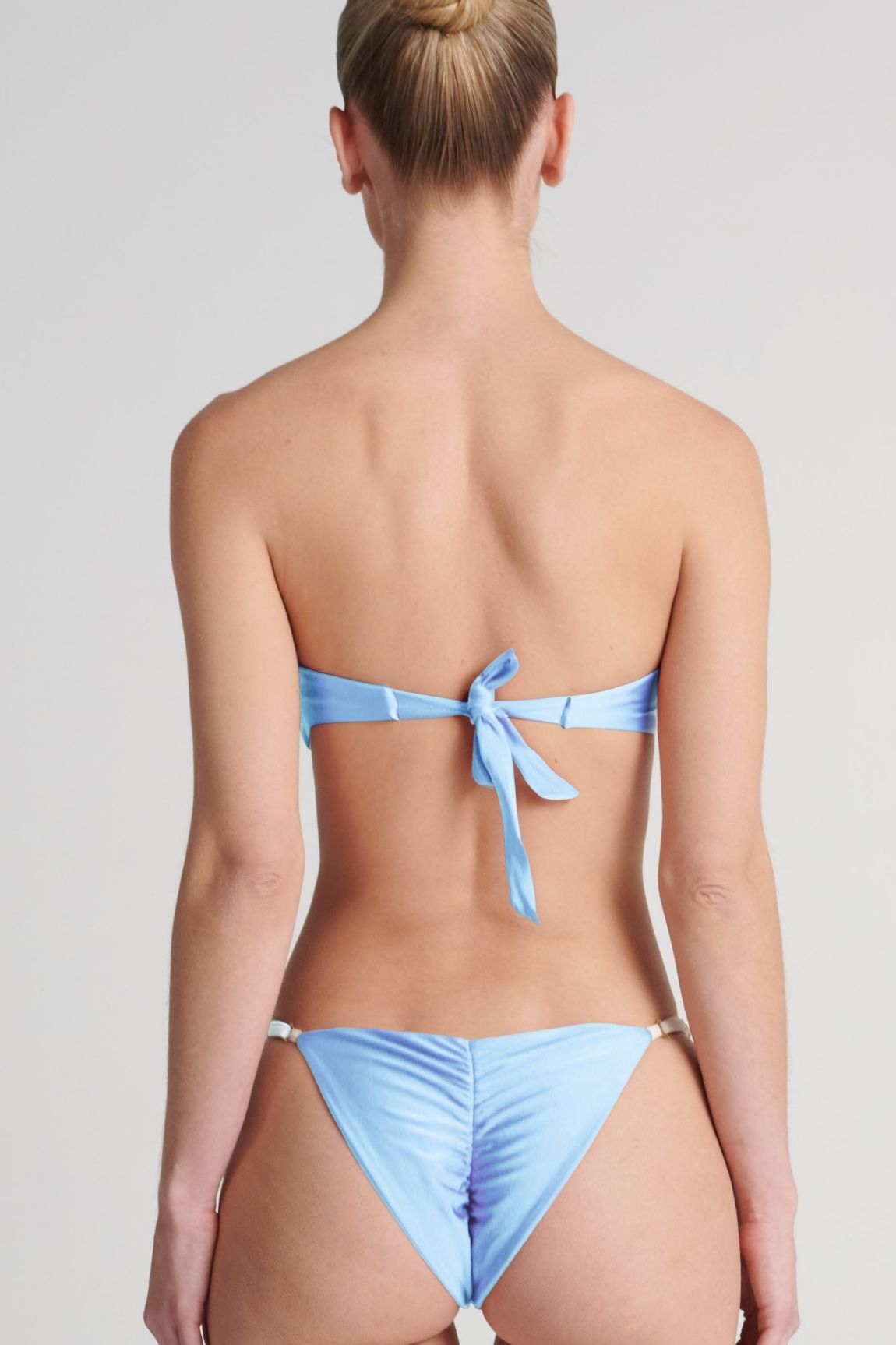 Bottom con tensores graduables en los costados en acabado en baño de oro, y fruncido en la parte posterior. EKO®FIBERS producida a base de botellas recicladas.