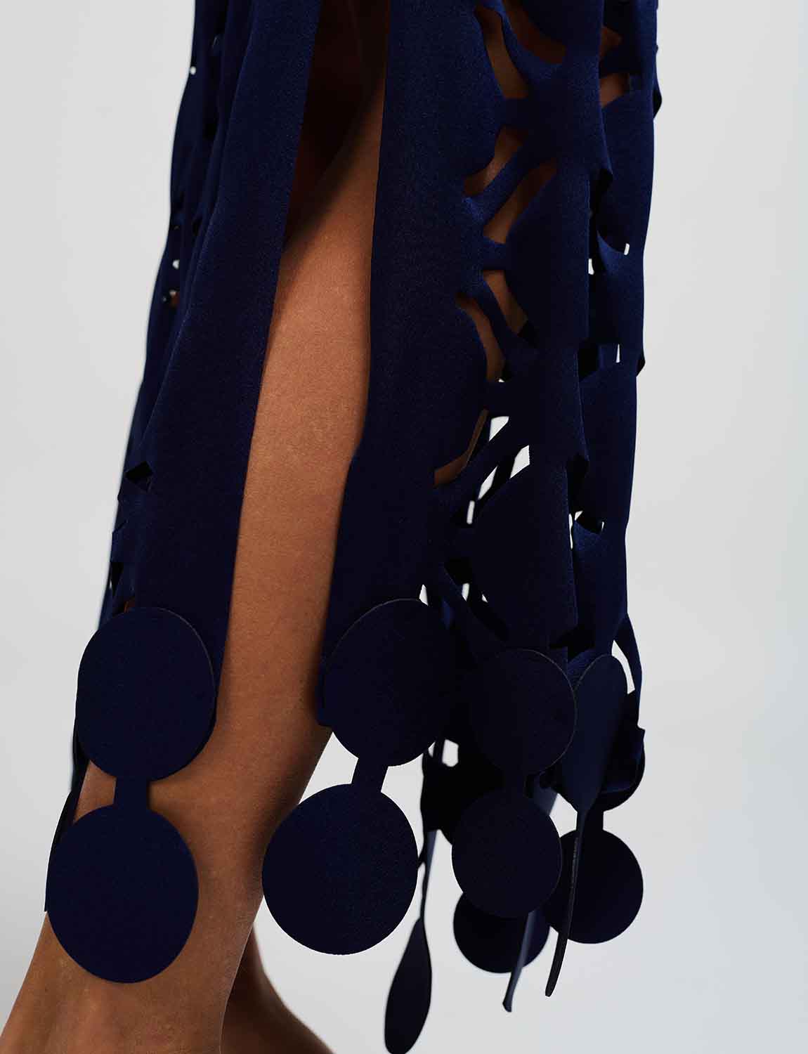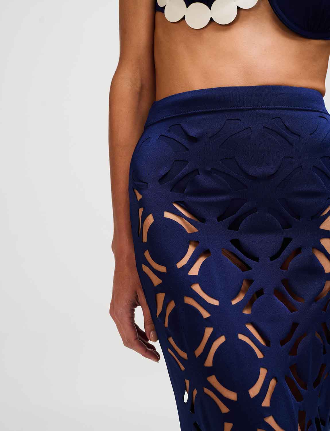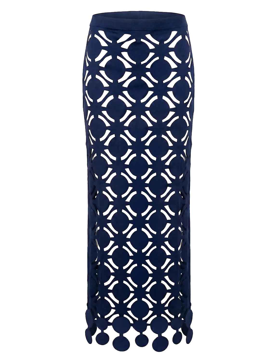 Falda larga con diseño exclusivo y creativo en corte láser, con pretina con elastico.