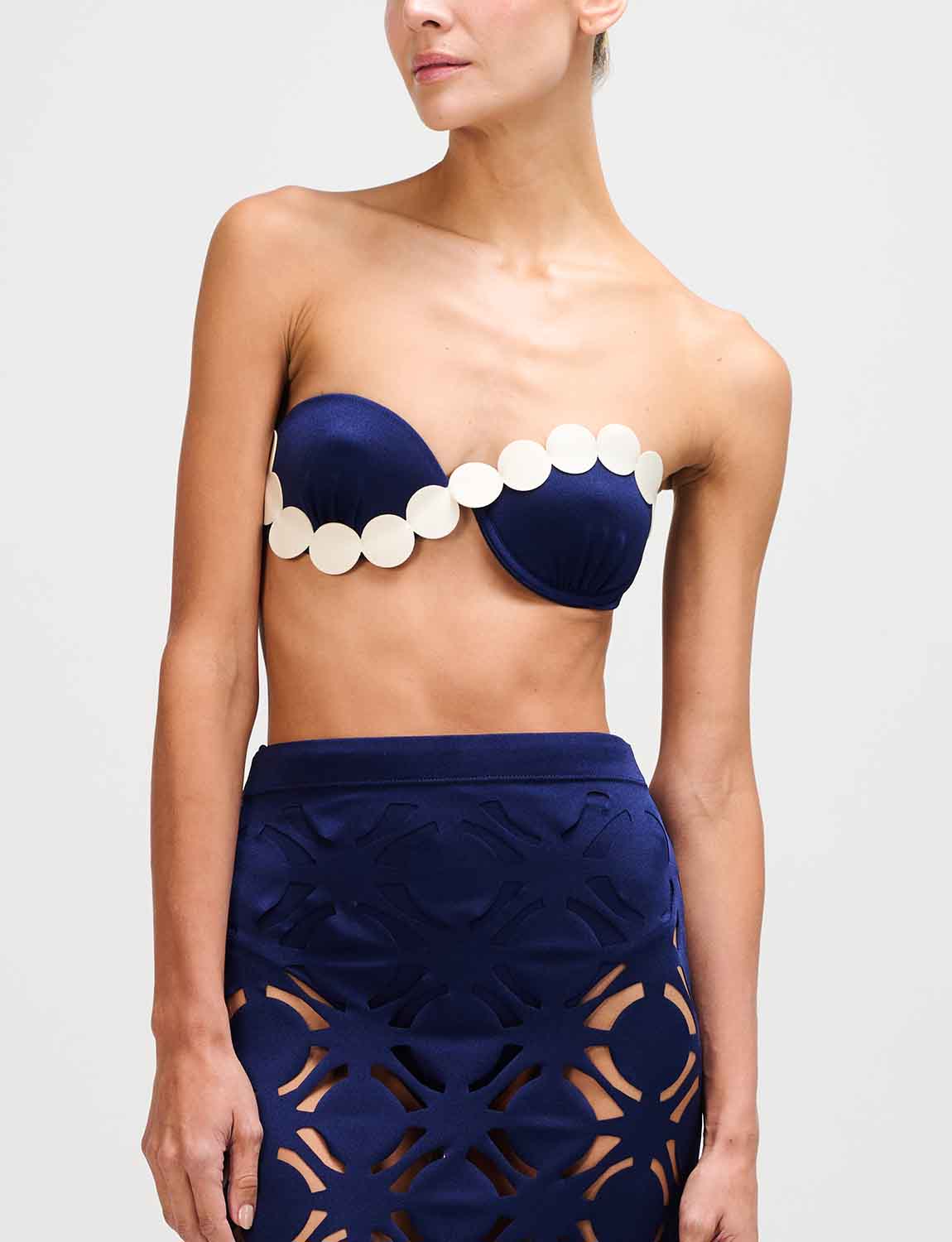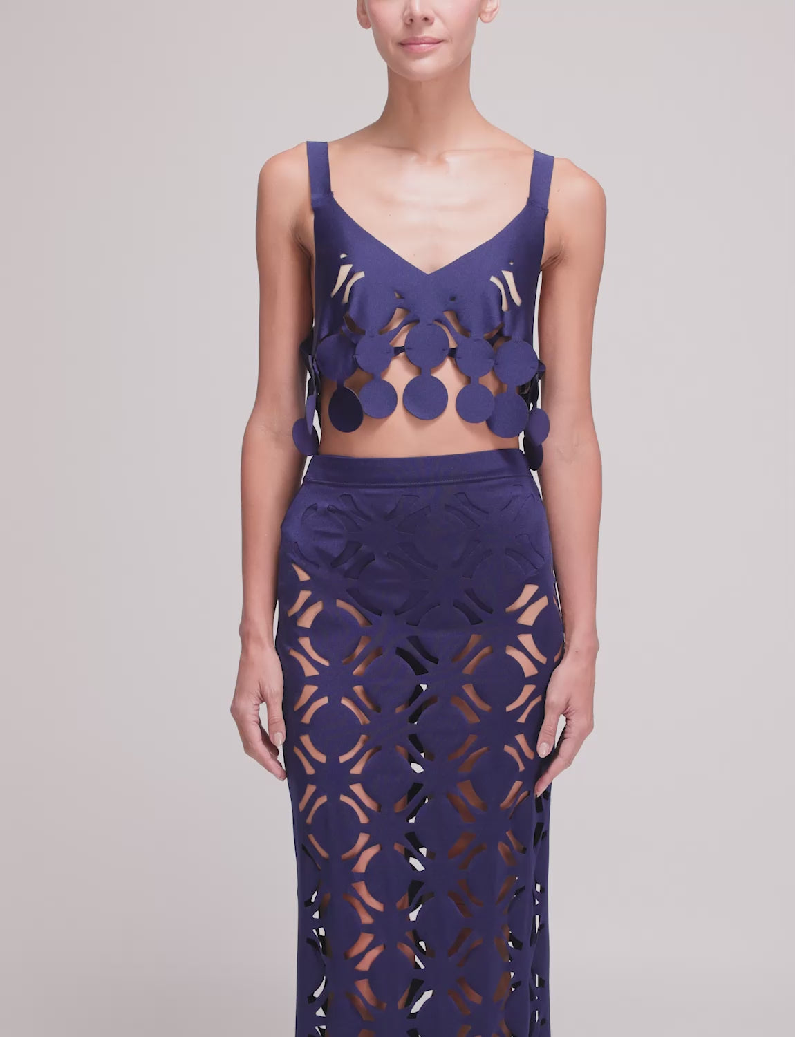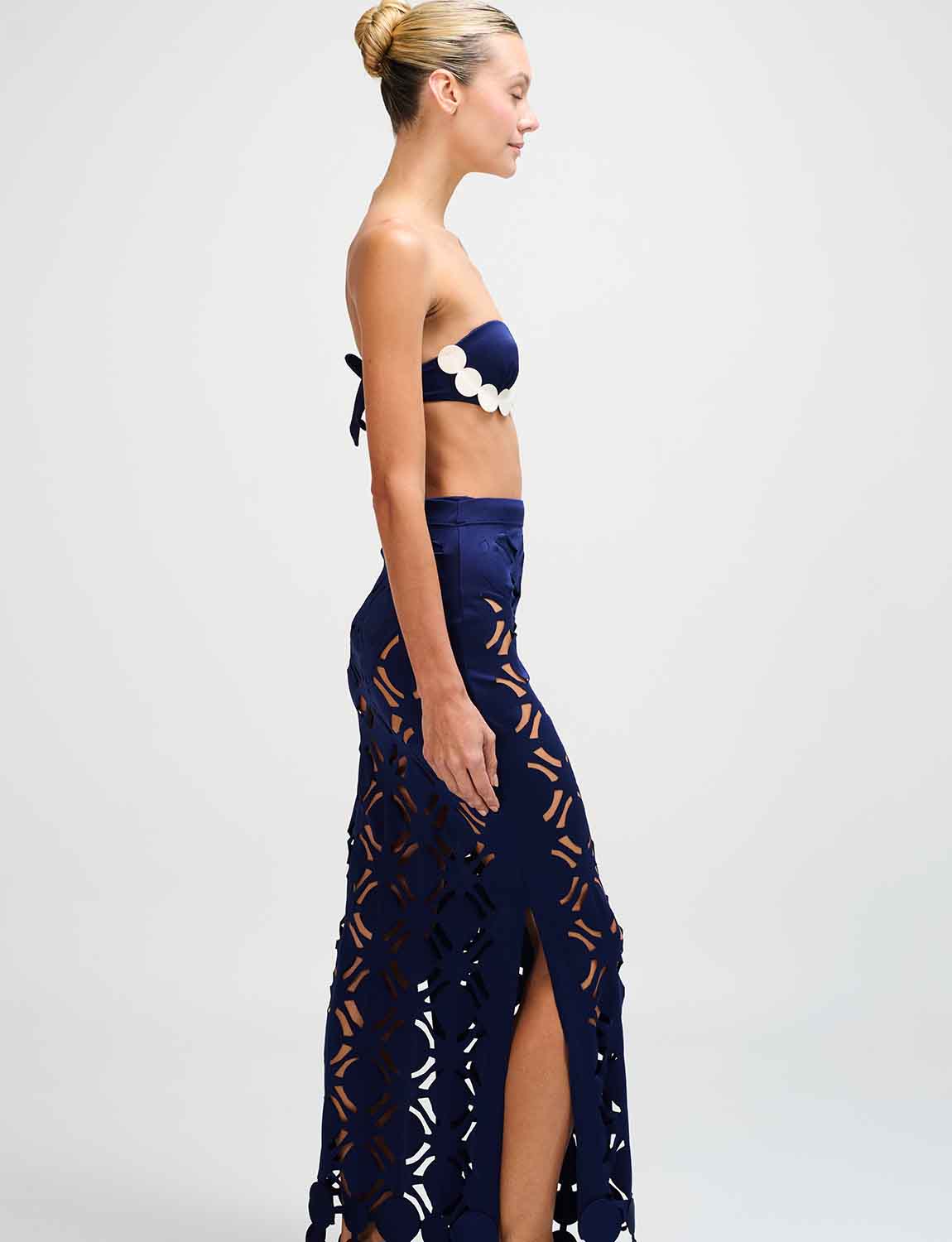 Falda larga con diseño exclusivo y creativo en corte láser, con pretina con elastico.