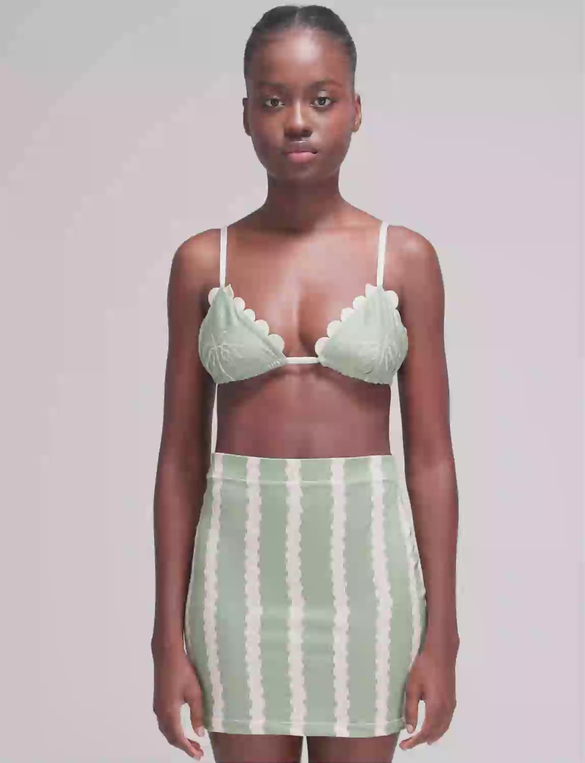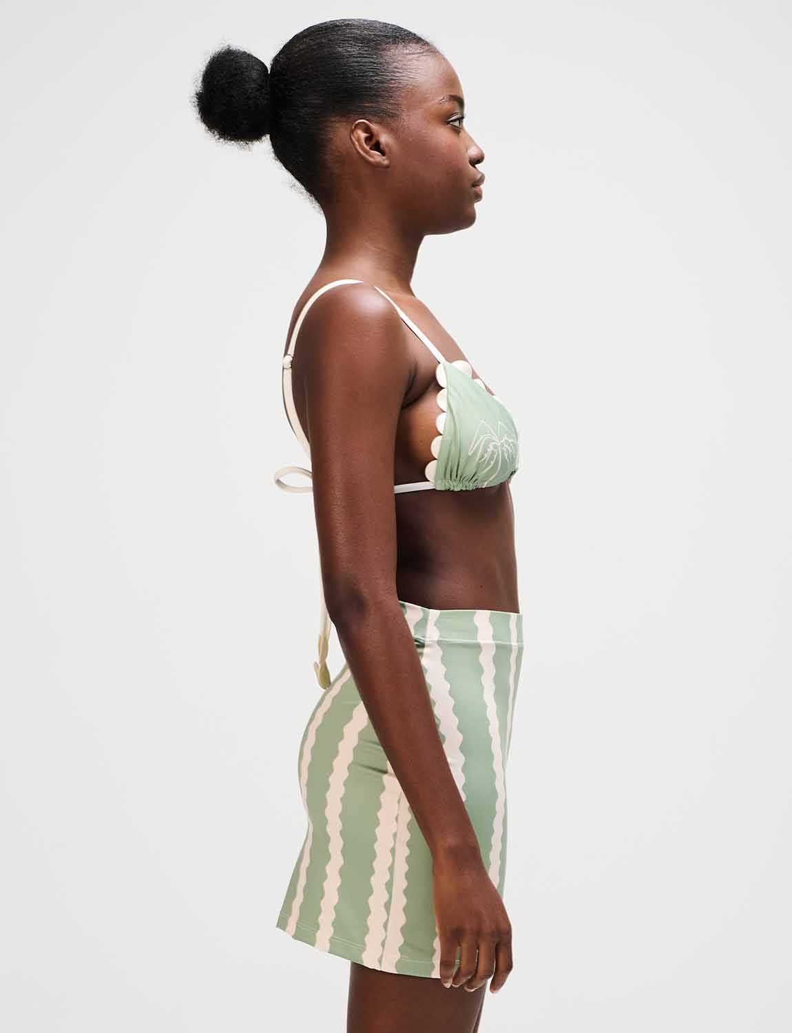 Falda corta con pretina elástica y detalle de flores laminadas en el ruedo, diseñadas en corte láser y cosidas una a una.
