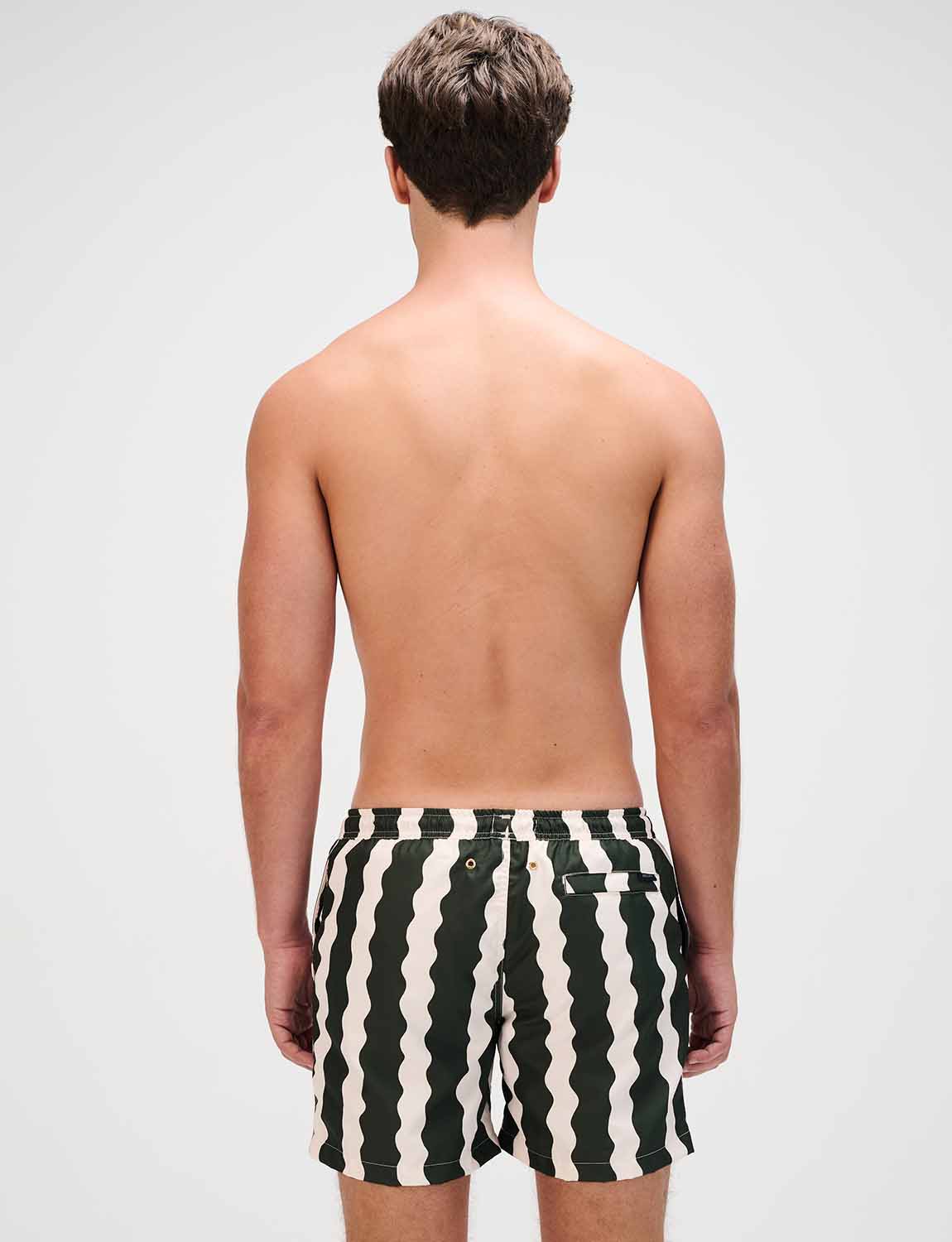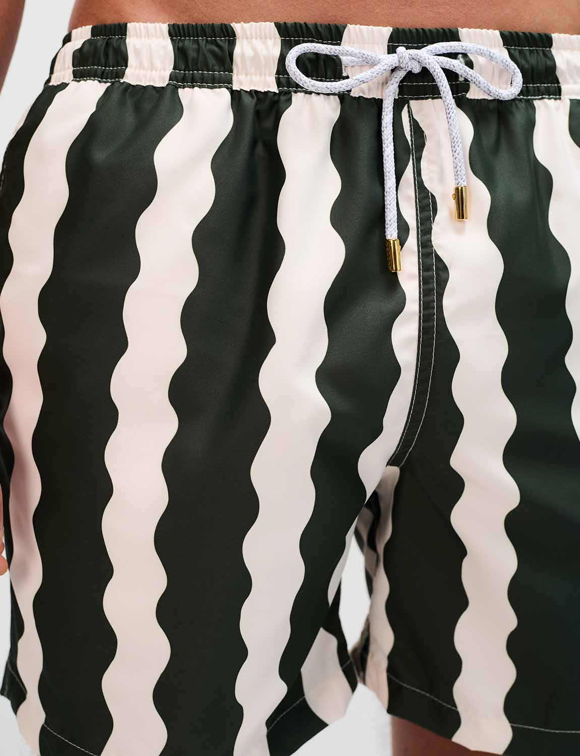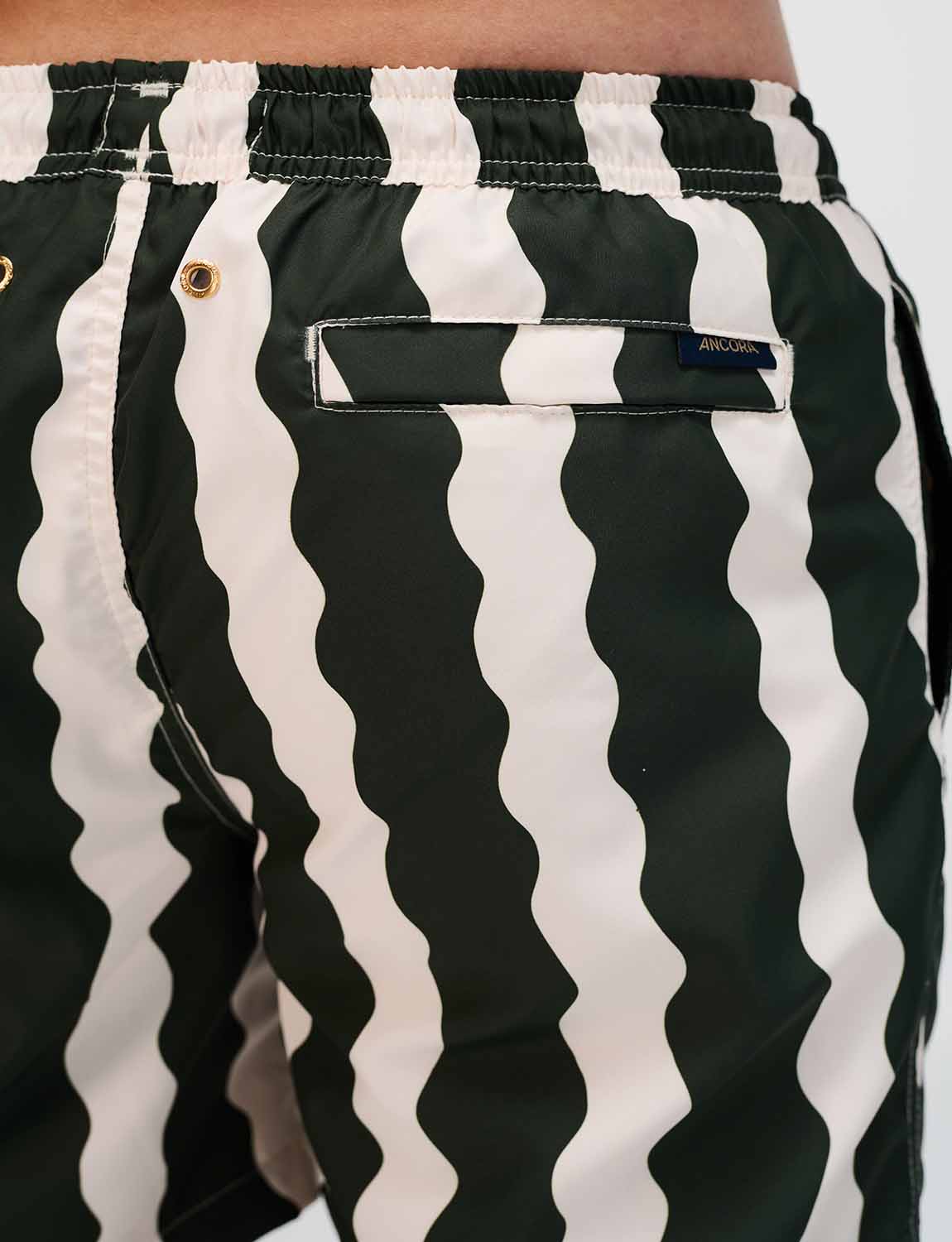 Pantaloneta de baño con print exclusivo ANCORA, cintura elástica con cordón ajustable, bolsillos laterales y malla interna.