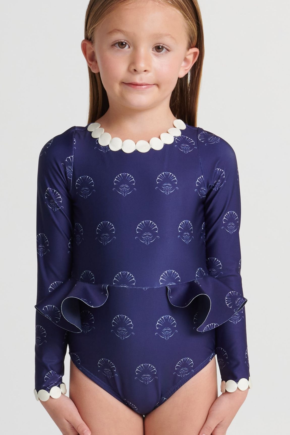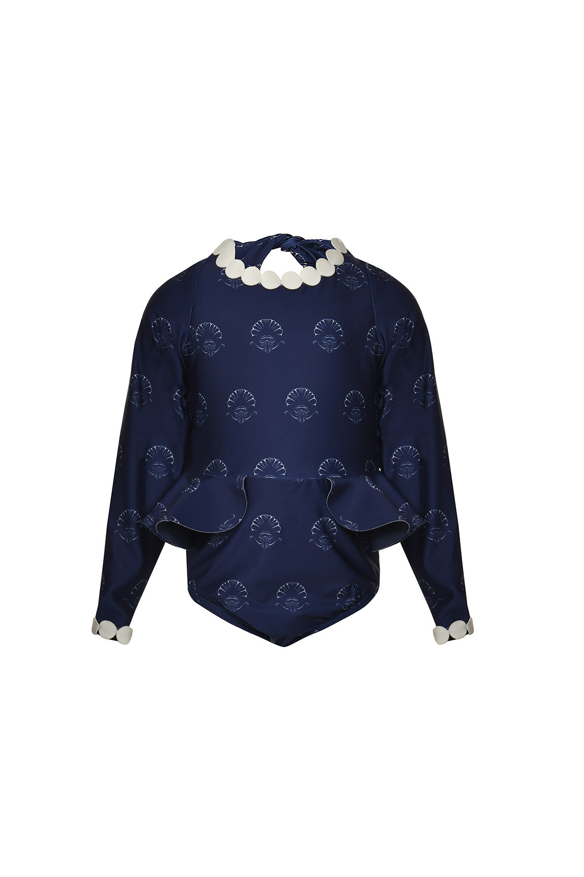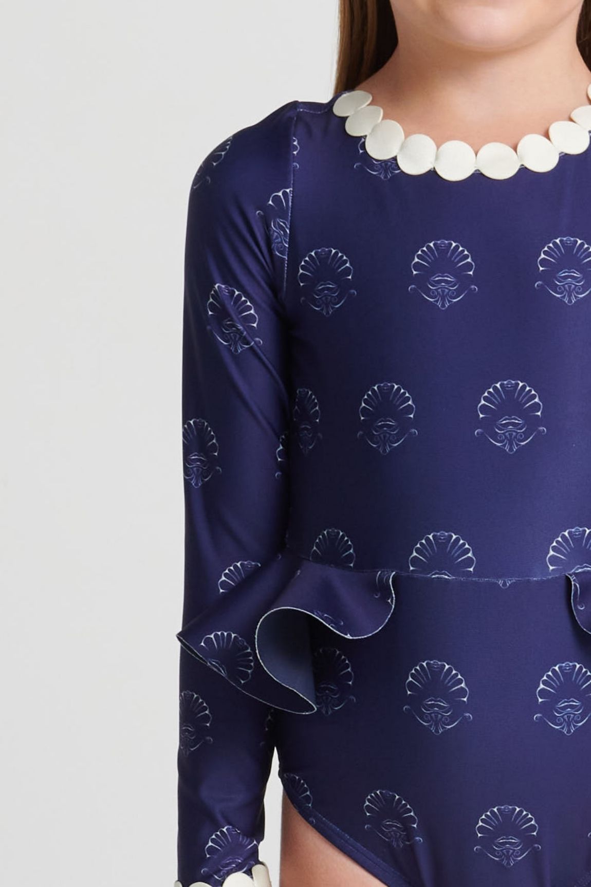 Enterizo de niña con boleros decorativos en los costados, moras decorativas en el escote delantero y mangas. EKO®FIBERS producida a base de botellas recicladas.