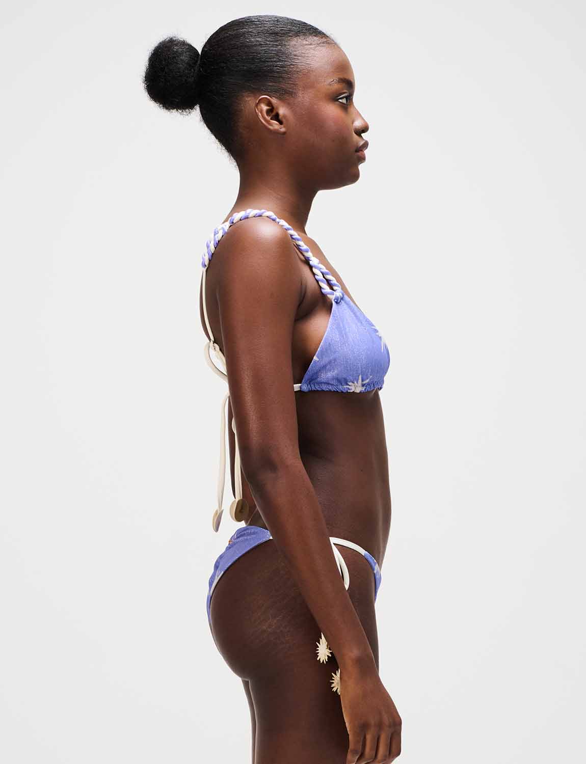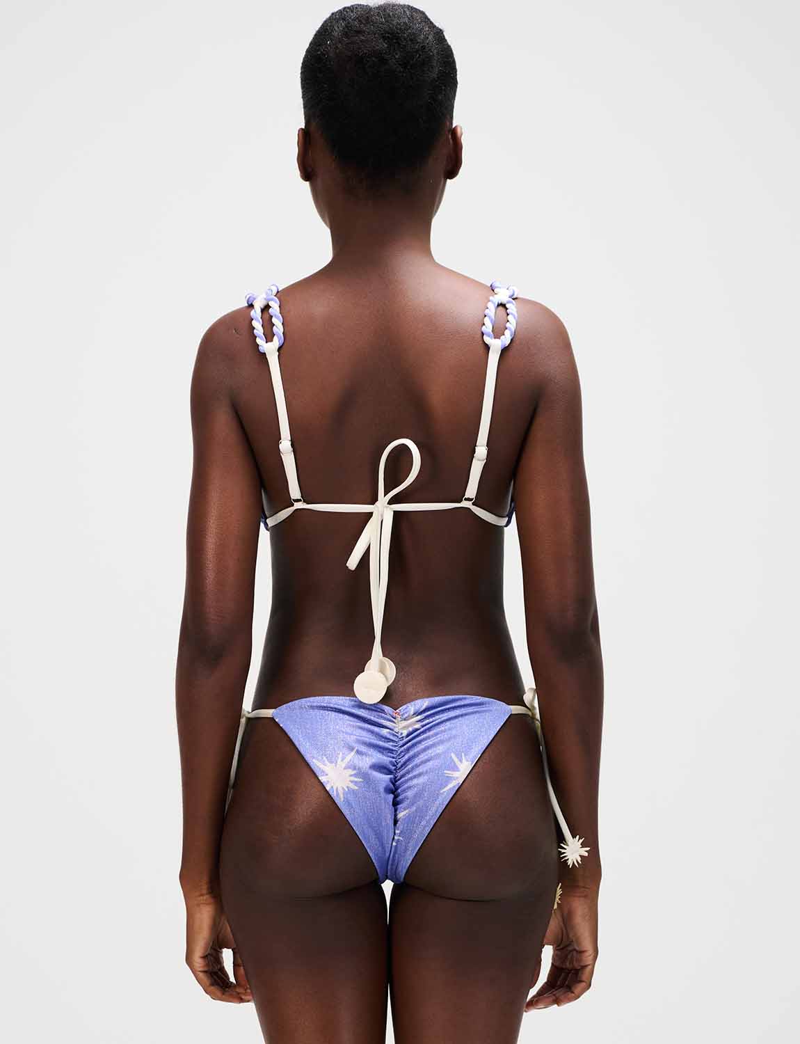 Top triangular con delicadas tiras trenzadas a mano que forman óvalos, ajustables mediante tensores con acabado en baño de oro. Espalda graduable con terminación decorativa laminada.